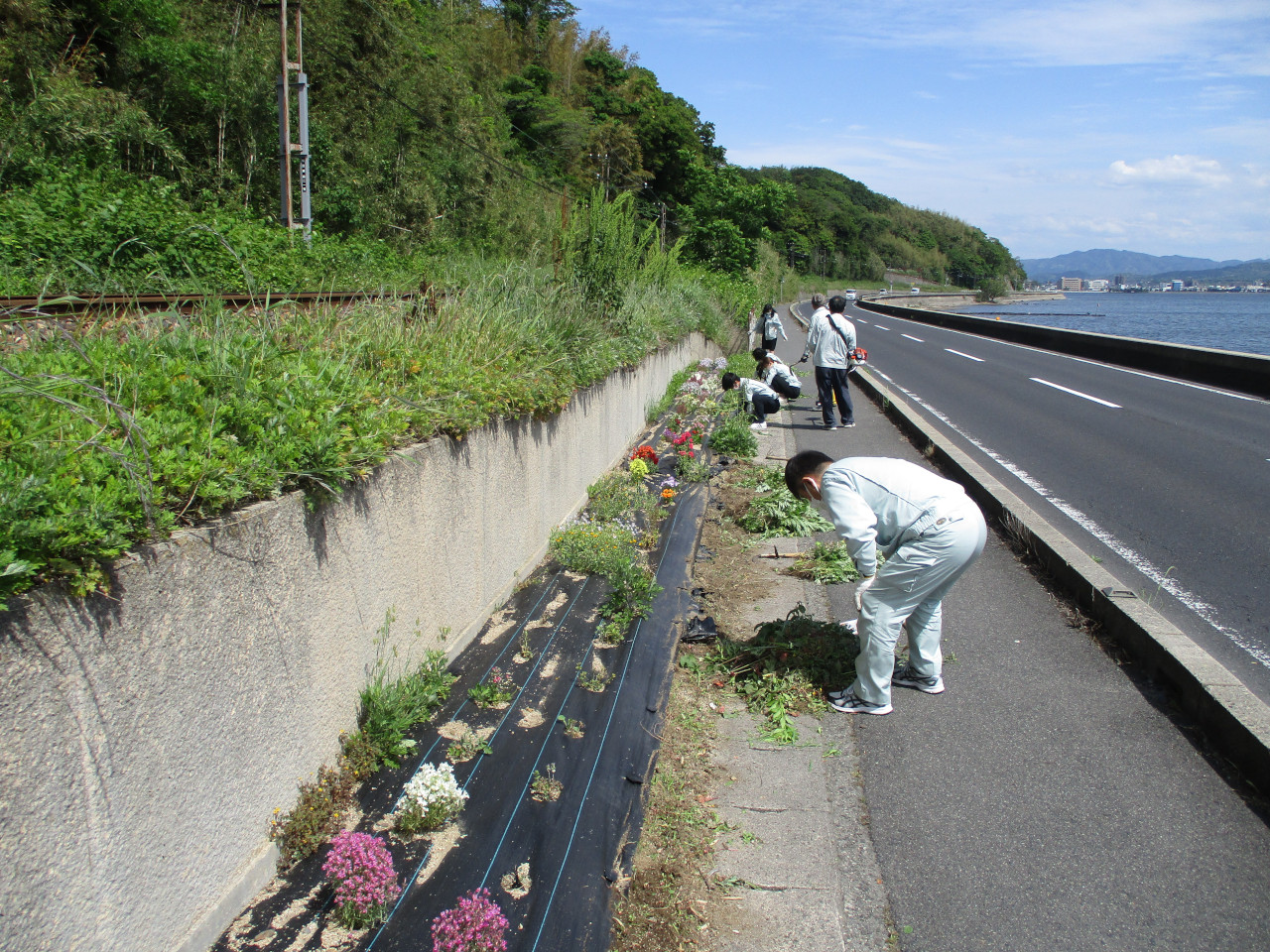 花壇整備(草取りや花の苗植え)や歩道の草取りを行いました。
